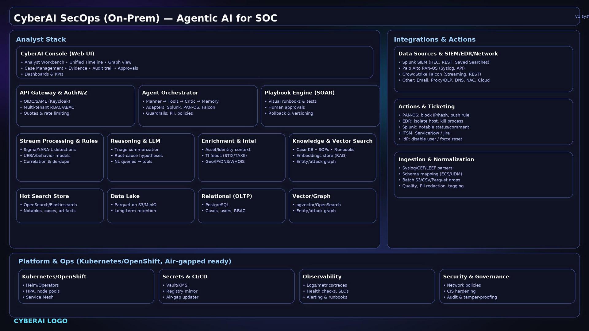 - Agent Orchestrator: planner → tools → critic → memory loop; adapters (MCP/tooling) for Splunk, PAN-OS, CrowdStrike, etc.; policy guardrails (PII, change windows, approval checks).